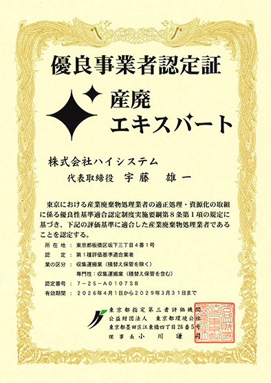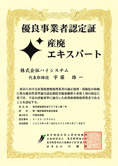 登録範囲 :特別管理産業廃棄物(感染性廃棄物)、産業廃棄物及び一般廃棄物の収集運搬並びに産業廃棄物の中間処理(破砕・圧縮梱包)に係る事業活動)